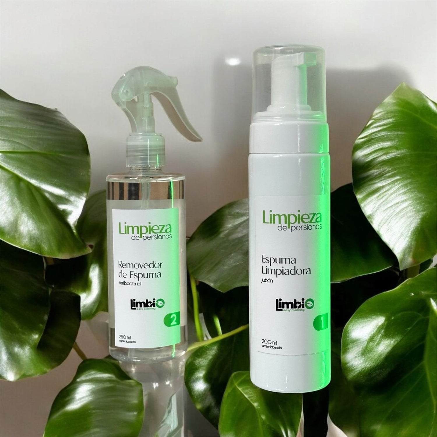 Sistema de limpieza en 2 pasos para persianas: Espuma Limpiadora (200 ml) que desprende polvo y suciedad + Removedor de Espuma Antibacterial y aromatizante (250 ml) para retirar residuos, desinfectar y dejar aroma fresco. Incluye esponja y paño de microfibra. Fácil de usar Hecho en Colombia.